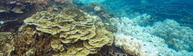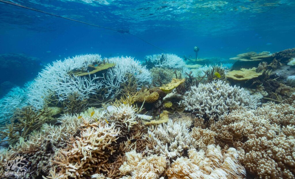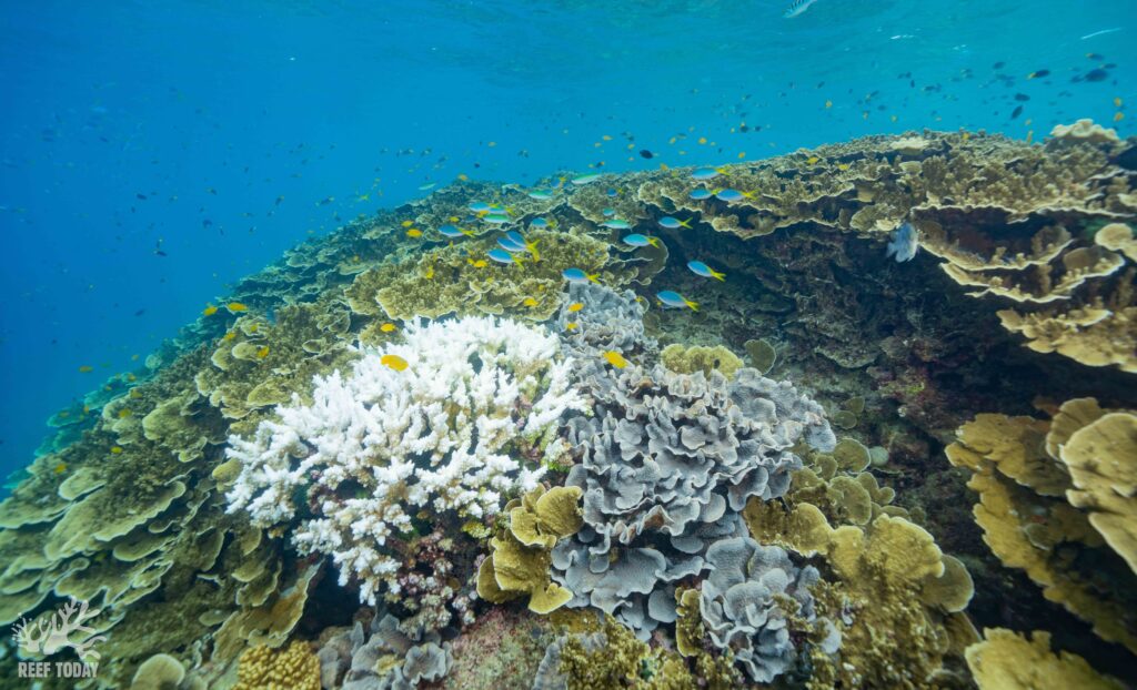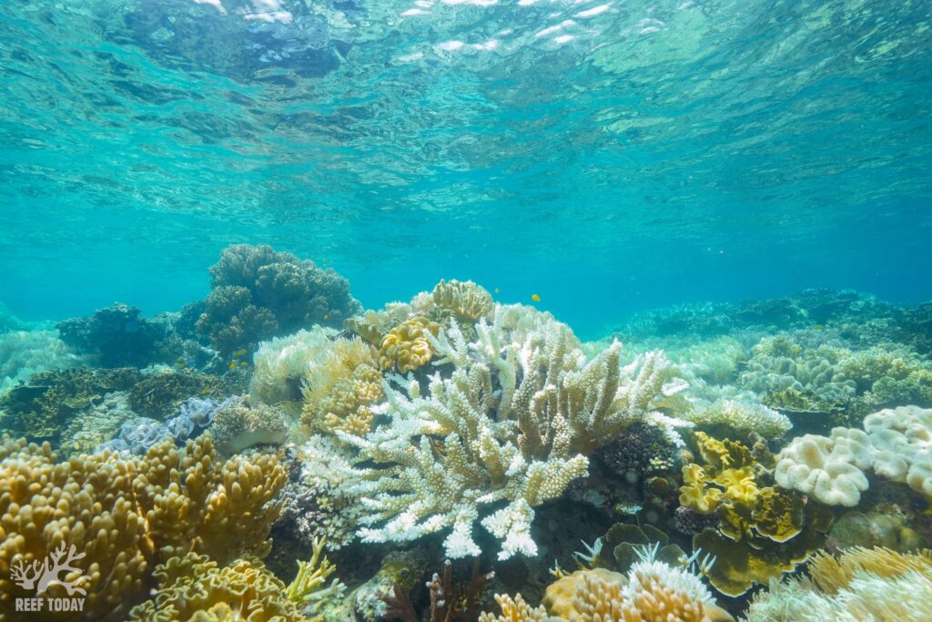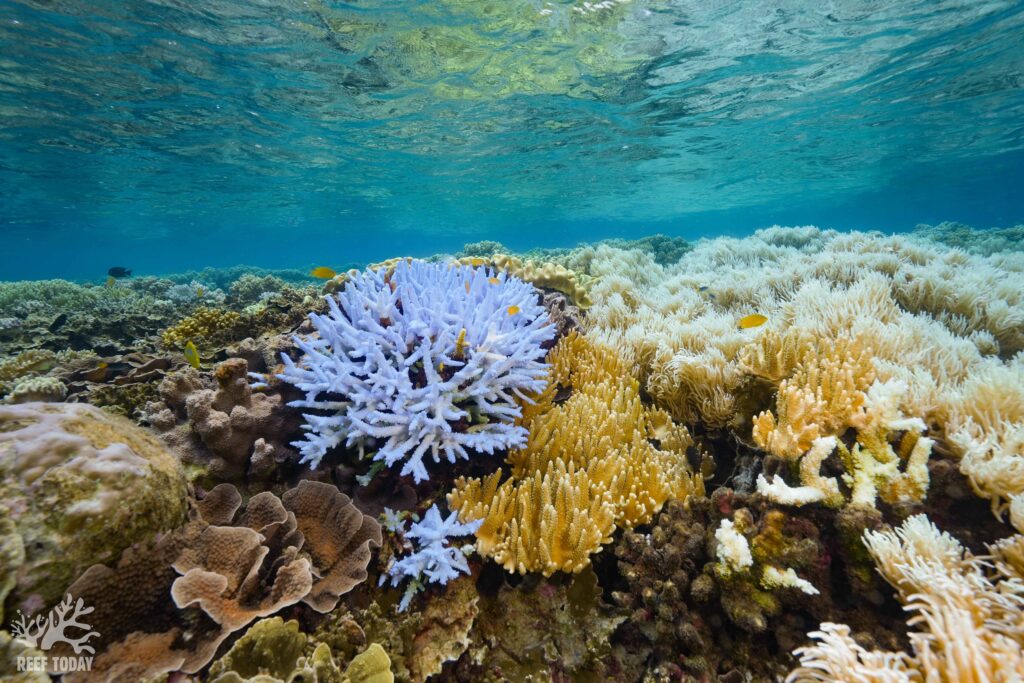 Many smaller Acropora plates exhibiting fluorescence, and varying stages of bleaching